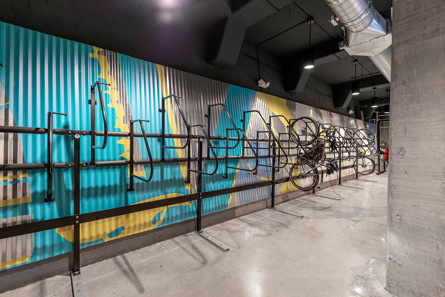 The secured bike storage room provides hanging racks that allow you to hang your bike and lock it to the rack, as well as a bike repair station outside the storage room.